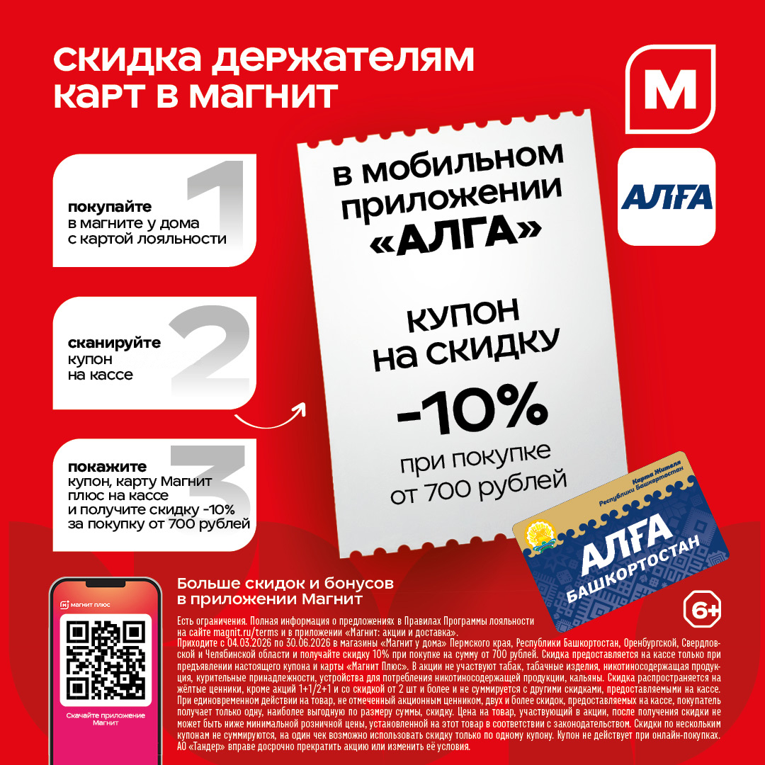 Приходите с 04.03.2026 по 30.06.2026 в магазины «Магнит у дома» Пермского края. Республики Башкортостан, Оренбургской, Свердловской и Челябинской области и получайте скидку 10% при покупке на сумму от 700 рублей Скидка предоставляется на кассе только при предъявлении купона и карты «Магнит Плюс». В акции не участвуют табак, табачные изделия, никотиносодержащая продукция курительные принадлежности, устройства для потребления никотиносодержащей продукции, кальяны. Скидка распространяется на жёлтые ценники, кроме акций 1+1/2+1 и со скидкой от 2 шт. и более и не суммируется с другими скидками, предоставляемыми на кассе. При единовременном действии на товар, не отмеченный акционным ценником, двух и более скидок, предоставляемых на кассе, покупатель получает только одну, наиболее выгодную по размеру суммы скидку. Цена на товар, участвующий в акции, после получения скидки не может быть ниже минимальной розничной цены, установленной на этот товар в соответствии с законодательством. Скидки по нескольким купонам не суммируются на один чек возможно использовать скидку только по одному купону. Купон не действует при онлайн-покупках. АО «Тандер» вправе досрочно прекратить акцию или изменить её условия.
